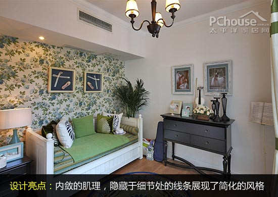 设计师解读:天花板整体白色设计,与墙面夹角处滚上绿边,营造了丰富的空间层次。在天花板造型上也巧夺天工,简单的几条人工横梁,就打造了仿似英式田园小屋的效果,层次感更加分明。