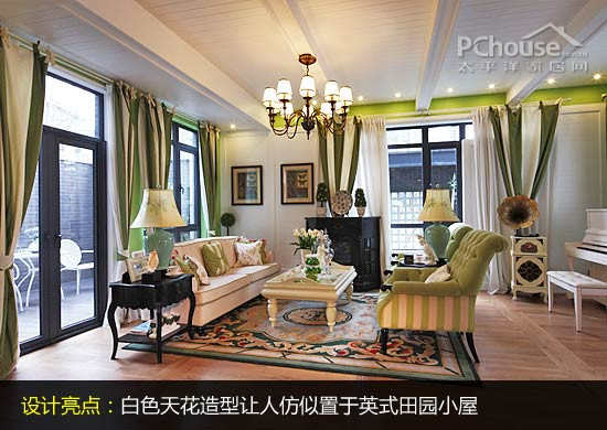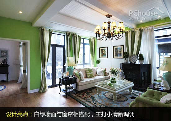 设计师解读:英式风格设计喜用布艺沙发,设计师在空间里布置了2张单人绿沙发和1张双人白沙发,两色比例完美分配,仿佛与墙面一起组成“私人订制”的客厅。