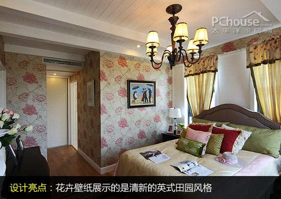 设计师解读:英国人对碎花图案情有独钟,喜爱在室内设计中加入此元素。鉴于碎花图案过于繁杂,在这套追求简约的婚房设计中,设计师改用大朵大朵的花卉图案壁纸营造雅致的氛围。