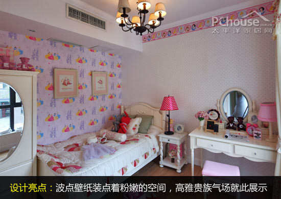 设计师解读:公主是对皇室后代的称呼,甜美有气质是对公主的固有印象。在儿童房设计中,通过波点壁纸打造粉红色调为主体的空间,搭配简约的英式家具,外加蕾丝滚边的轻纱窗帘,小巧精致的卧室散发出闺中甜美的蜜意。