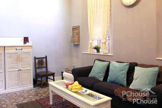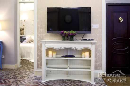 大门右侧摆放电视机,原先的电视柜样式像极了欧式的壁炉,静怡在中间加上两个玻璃层架做收纳,摆放白色的圆蜡烛,另外还在通往卧室的墙角摆放蓝色小几,以造型简单的米色台灯装饰,营造浪漫的宫廷气息。