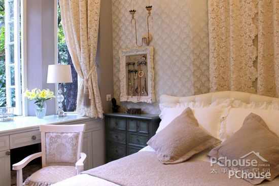 卧室浪漫美丽极了,米色的蕾丝布帘点缀了这个充满公主梦的卧房,它们和客厅的窗帘是一套的,都是在布料市场找到婚纱边角料,自己再重新DIY做成。灰绿色的斗柜是闺蜜的妈妈淘来的外贸货,静怡自己再在上方用相框DIY了一个首饰架,搭配细细长长的复古壁灯。