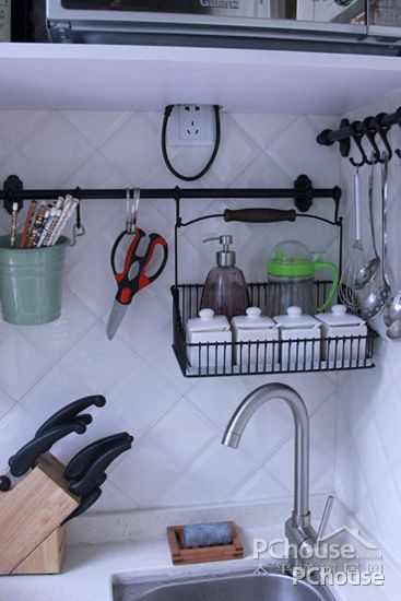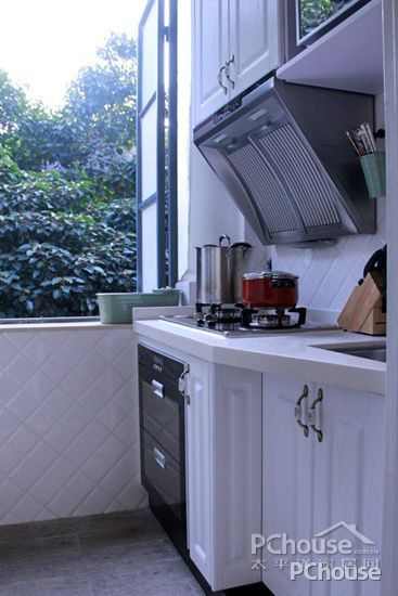 因为先生非常爱明火煮食,所以在洗手台的下方刚好安置了一个小柜子,放得下一瓶小煤气罐,抽油烟机、橱柜居然都刚刚好放得下。烹煮美食的时候,从高高的圆拱形窗户看出去,绿荫成片,生活美好。