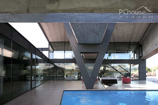 整个住宅由建筑师幽默地称之为“G点”的二十吨重大理石收顶——它不仅是整个建筑物物理上的平衡砝码,同时也象征着引力的存在。