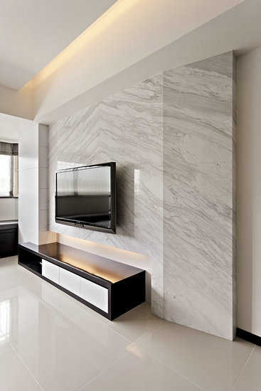 编辑点评:对花线条铺排出豪宅的格局,并在墙面右侧以斜切角转折减轻墙面的厚重感,也让延伸的线条自然隐没入后方的墙面中。