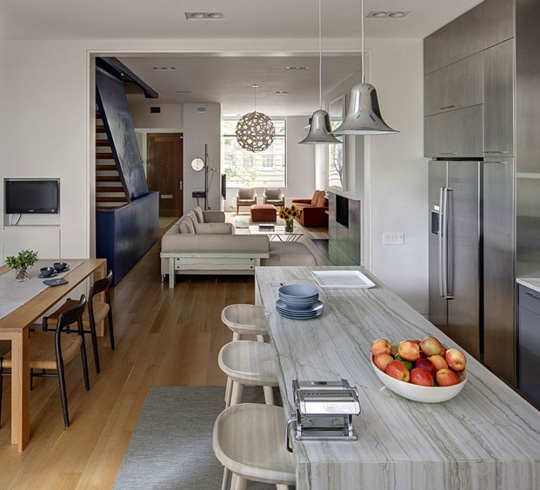 编辑点评:设计师通过天花板进行区域分隔,保持空间的完整性又产生一览无余的视觉效果,让整体空间更加开阔。