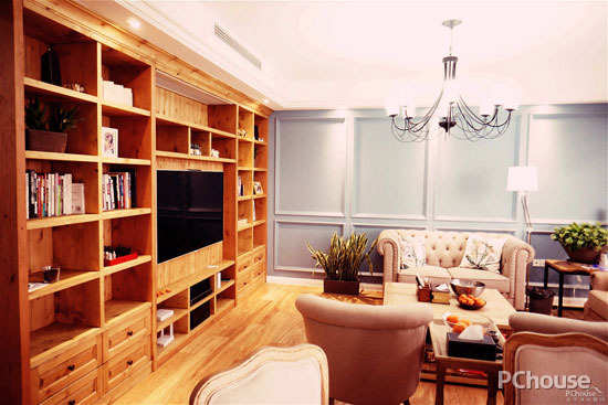 客餐厅装修都以略带做旧感的灰蓝色墙体搭配白色石膏造型吊顶,富有历史气息的实橡木地板让整个空间呈现人文气息,整个屋内的色彩明亮大气,呈现复古跳跃的法式乡村风格。