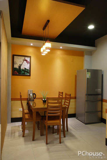 以保有空间开阔为出发,线帘的穿透串连起客、餐厅区域,天花上深底色调加以造型定位,巧妙切划出用餐环境。