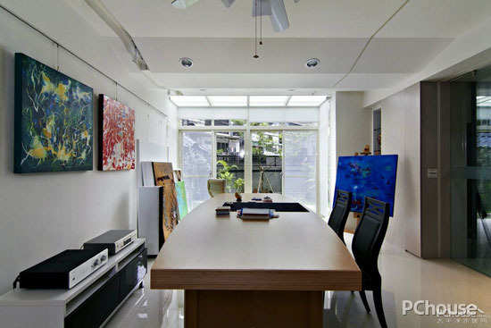 为让庭院绿意入室,设计师于画室与和室藉以落地窗面安排,立面后方还藏有洗水槽供女主人清洗画笔使用。