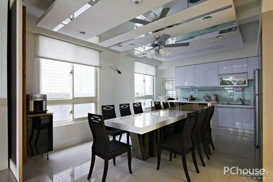 厨房、餐厅相邻,总体风格更为现代一些,墙面装修以时尚深灰色仿古砖为主,考虑到厨房清洁需要,地面铺仿木纹地砖,基本维持与客餐厅木地板相统一的装修风格,一体化白色橱柜呈半开放式,有效增大总体空间。