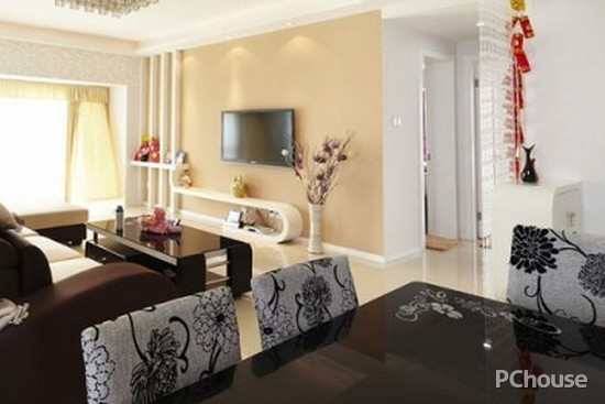 客厅吊顶及电视背景墙简单几何造型,墙面局部的壁纸,沙发等软装配饰用温馨浪漫的暖调,突出了主人浪漫唯美的生活品位。