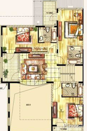 该层明显可以看出是为业主自身提供休息的空间,共有三间卧室,每间卧室各配有一个卫生间,私密性较好,同时采光通风效果也较好,但是整个空间布局稍显紧凑。