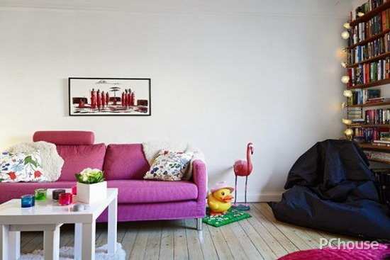 客厅的色彩用了如此多的颜色,却不显得花哨,反而给人一种灵动的感觉,而在装饰方面,更是大胆的运用了各种摆件,黄色的小鸭子憨态可掬,粉紫色的仙鹤则仙姿飘渺。