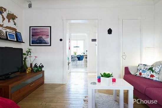 很舒适的沙发,布艺制作,而绘画着花草图案的抱枕则起到了画龙点睛的功效,让人不禁眼前一亮。而客厅虽然狭小,但是却罗列整齐,倒也并不显得拥挤。
