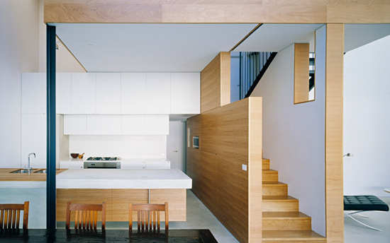 设计提要:Bondi House属于改建项目,设计师大刀阔斧地进行重组和扩建,改变了原有的不合理的格局,使房子变成适合一家大小居住的空间。Bondi House最出彩的改造在于对阳光的引进,包括30°的屋顶造型,使冬季的阳光可以穿透并照射到后院。室内的中央楼梯也暗藏玄机,不仅让空间造型更特别和美观,也起到分隔生活空间、连接楼上居室的作用。