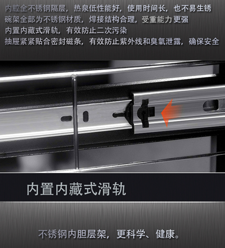 它从不随意开口,深谙开与关之间的秘密。我就是爱它这样的沉默,让一切变得更有默契。精确的门控开关装置,外加门锁功能,全面有效防止了紫外线辐射和泄露。隐藏式铝合金拉手,加厚不锈钢层架,隐藏式静音导轨,杜绝餐具二次污染,静音又顺滑,体贴又温柔。