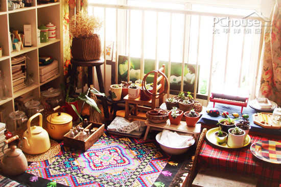 搭配TIPS:原本不起眼的小阳台,被主人用书籍和植物打造成了浓郁zakka味道的小角落,高脚凳上的干花,也是不可缺少的一景。