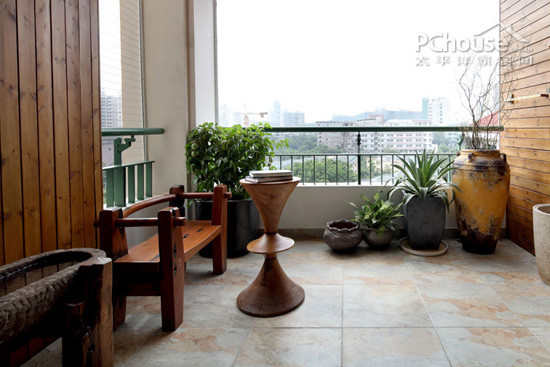 搭配TIPS:为了营造空旷的意境,主人在阳台上只摆了少量的植物,加上几段枯树枝,摆上老式的水槽和简朴的桌椅,有大智若愚的味道。