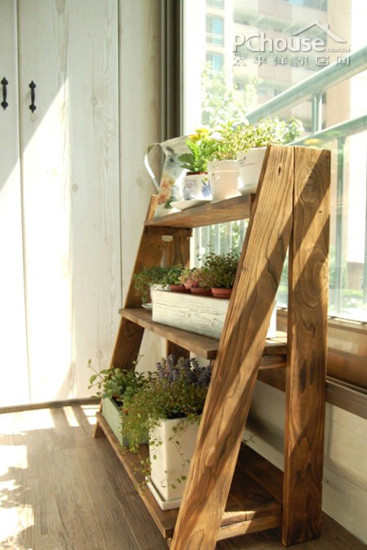 搭配TIPS:阳台空间不大,所以将数量较多的小花盆摆放在木质收纳搁架上面,这样省空间且不显杂乱。