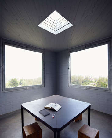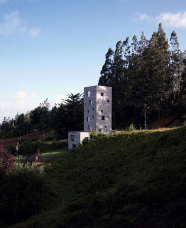 这是一座立于山上的钢筋混泥土塔楼,天然未加修饰,建筑设计师尽可能简化了选用的材料。从具体构成,让粗糙的纹理外观混凝土骨料层。不同大小的方形窗户穿刺这些墙壁,玻璃窗与凹陷给予厚度感。在这里,柏树、电线杆和阳光都变成装饰,锁定到一个连续的螺旋,慢慢地上升向后的视线,这时你已经驻足欣赏它了。