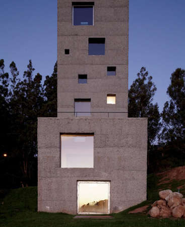 【太平洋家居网设计频道】这座七层的混凝土建筑位于智利的乡村,设计师主张随意的生活方式,把这个建筑作为住所以及其工作室,结构的两层基座部分淹没到山坡上,刚好跟自然融合在一起,创造出充满现场创造感的随意性建筑。庞大的地下室车间和生活场所,粗糙的纹理外观混凝土层,不同大小的方形窗户镶嵌整个外立面墙壁,玻璃窗的凹陷给予整个建筑一种厚度感。
