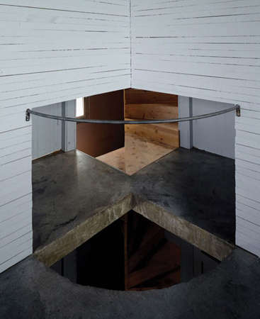 白色的支撑结构与墙面,生活区域的原木色旋转楼梯和呈铅色的混泥土地板,三者形成鲜明的对比。闭合结构向高处伸展,慢慢缩减为方形房间的入口。从它的中心升起,创造了由楼梯相连的混合物。