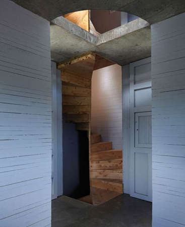 设计师用两个楼梯来展开楼层的安排、尺寸和几何结构的确定,展现内部之间的关联。两个螺旋式木楼梯通向主要居住区。第二个楼梯通向从讲台到三个最上面的楼层,在楼板缝隙提供的上方和下方有意想不到的美景。