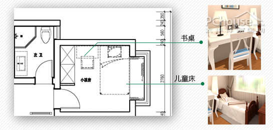 2、面积较小,刚好能容纳儿童床及儿童家具,配置合理。