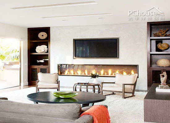 推荐理由:在这个北欧风格的客厅里,毛茸茸的白色地毯和火光明亮的壁炉都给人温暖的感觉,填充储物柜的就是北欧风格的雕塑和艺术品了。