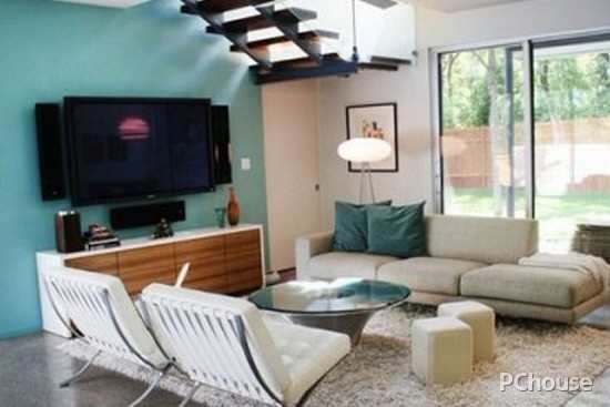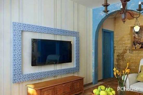 这款电视背景墙的设计原理据说来自于相框,边缘选用蓝色的马赛克瓷砖为材料,这样的设计能够让简约的客厅中透着一丝华丽。