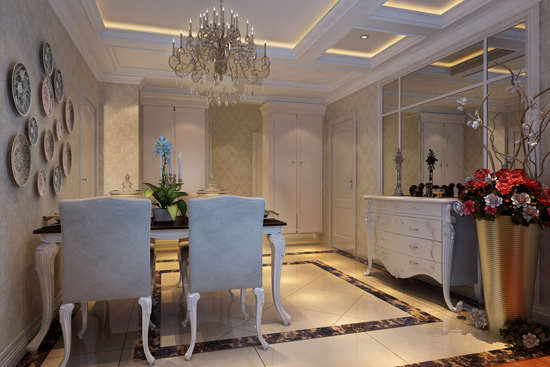 餐厅:餐厅在一独立空间,主题色调白,配以欧式奢华风格桌椅,高贵典雅。