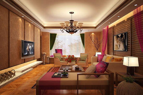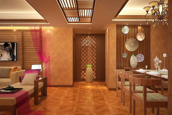 隔断:中央下延的天花板与远景的藤艺装饰制造出隔断空间,实现了客厅与饭厅之间和谐的过渡。(返回 专属私宅升级)