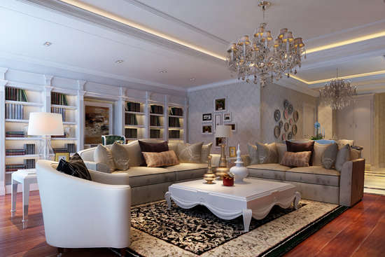 客厅:白色套框及护墙板做客厅背景墙,其余墙面都采用壁纸。(返回 专属私宅升级)
