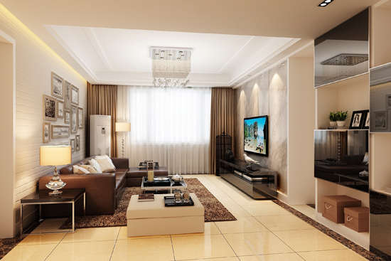 客厅:白色套框及大花白石材做客厅背景墙,其余墙面都采用白色墙漆,沙发墙用了白色的陶瓷砖上墙。
