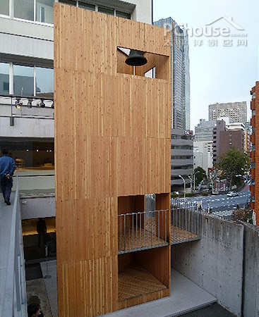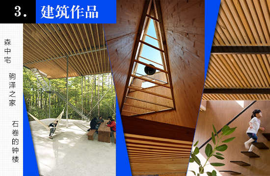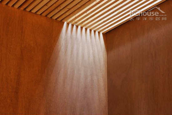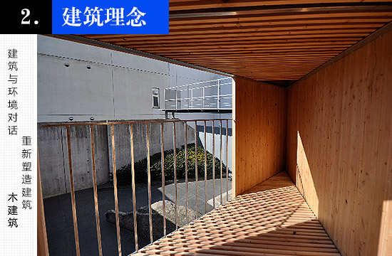 这个木结构外面所用的材料,是从澳洲进口的建材,木头经过常年的水浸,所以非常重,比一般的木头要沉稳,其既有石材的表面硬质的感觉,又有木材的柔软的感觉,是长谷川豪在做过模型的基础上完成的。
