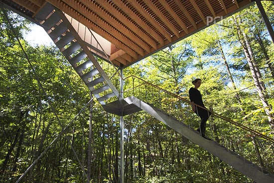 建筑师设计了一个令人生畏的陡峭楼梯通往架空建筑内部,其无框的玻璃窗和一个开阔的平台让居住者可以直接与自然亲近。像百叶窗一样的地板和天花板将室内外的边界模糊,森林中花鸟鱼虫交织不断的视线和声音盘绕着这座建筑。