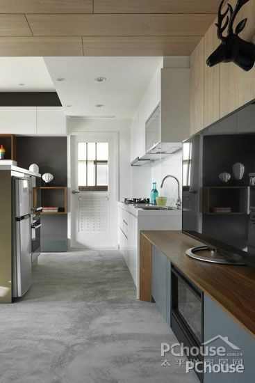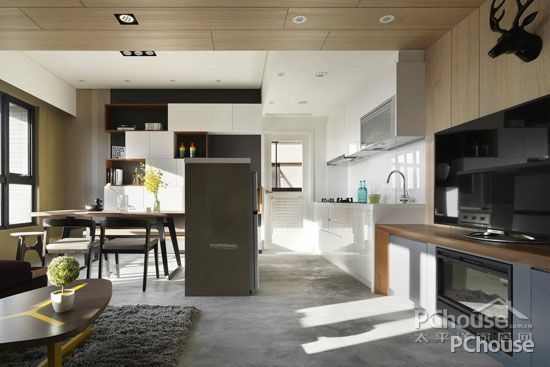 餐厨区-将吧台的台度拉高,让厨房里头的电器设备得以整合入内。