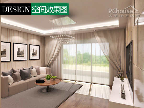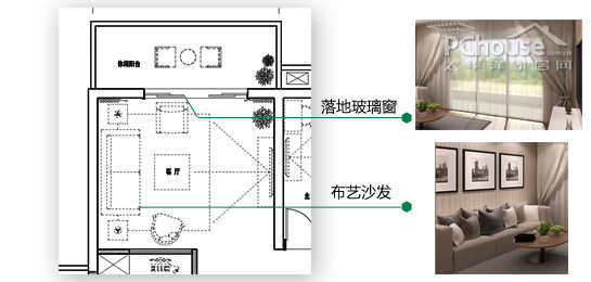 2、设计师为业主挑选了灰色搭配杏色的沙发,阳台采用落地窗,光线充足。