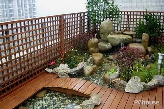 在阳台上铺黑白的鹅卵石,种上中国苏州园林中最常见的荷花、翠竹,一个理想中的世外桃源就这样生成了。