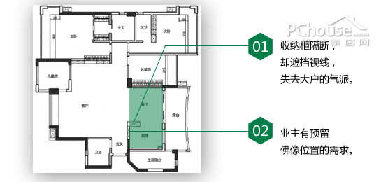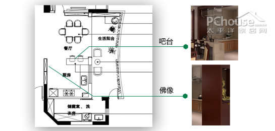 1、餐厅靠大墙侧要安放佛像,设计时需要预留空间。