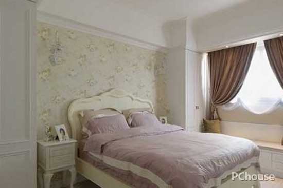 三居室中的卧室装修,整个简欧风格的卧室十分的唯美高雅,象牙白的双人大床看上去就很舒服,紫色的床品显得卧室特别的浪漫,还有床头背景墙的翠花壁纸,将卧室装点得有点小田园的感觉!