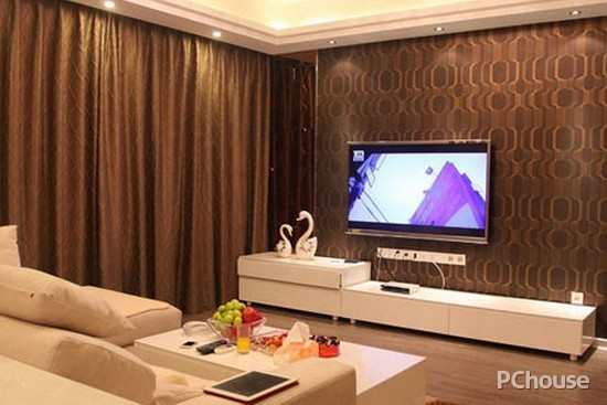 我们再来看看客厅:布置非常大气,简约的电视柜,时尚小资。放上一对精美的天鹅造型的饰品,感觉很漂亮。电视背景墙采用了素雅的壁纸来装点,正好和客厅的落地窗帘颜色很一致,感觉很大气!