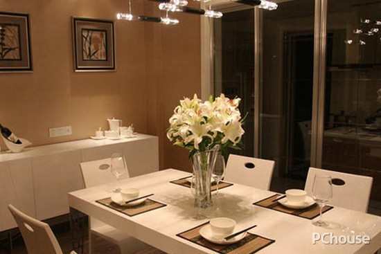 非常时尚的餐厅设计,纯白的餐桌椅组合,质感十足。再看餐厅的一个小细节,餐厅柜的区域,墙面是一对装饰画。很漂亮,精美造型的水晶灯也是别具一格,让餐厅散发着耀眼的光芒!