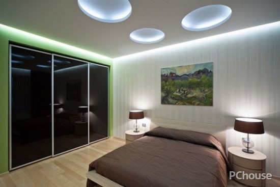 天花板的灯饰造型独特,中和了卧室方正单调的格局,绿色和灰色形成强烈的视觉冲击。