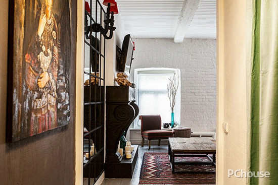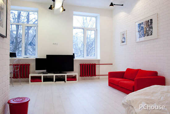黑白主色调搭配红色家具,简单而不失灵动。做旧的墙壁让空间十分具有质感。