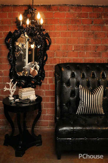 故意露出砖体的墙面与亮皮复古沙发相配,在温和灯光的照耀下沉淀出别样的异域风味。