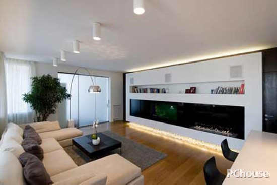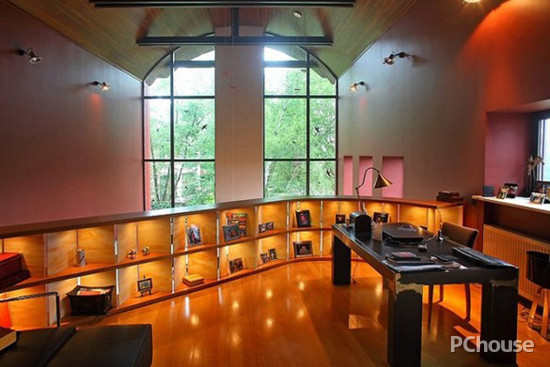 壁柜的灯光设计使室内明亮异常,搭配极具现代感的书桌,非常有格调。而造型独特的壁炉又让房间增添了浪漫气息。