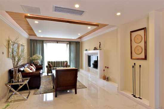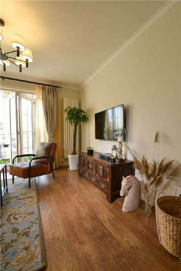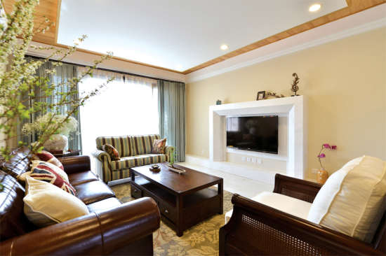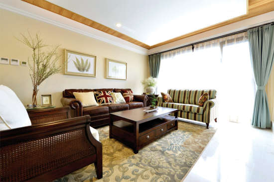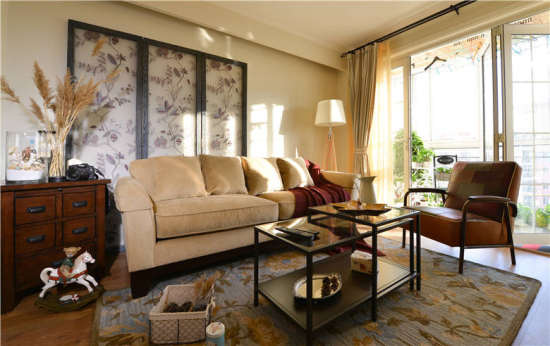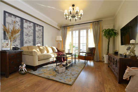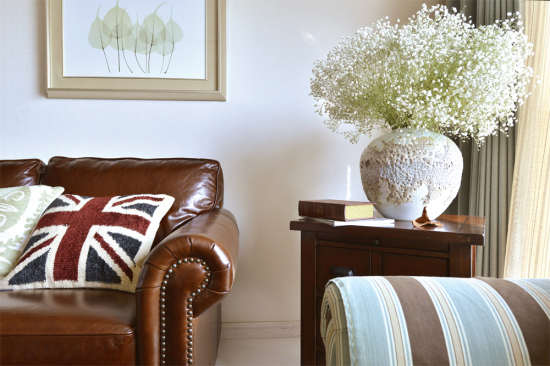 编辑点评:在空间的设计上,小饰品是能起到极大作用的,复古的茶几上摆着插好的雪柳、背景墙上裱了一幅简单的画、沙发上各式图案的小抱枕,这些小饰品放在一起,为客厅增色不少。