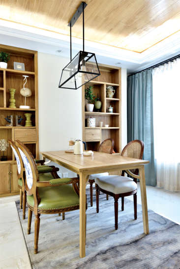 编辑点评:不得不说,在有限的空间里,多出了这么一个设计,是一个益举。设计者将中国的对称之美加到餐桌设计上,从餐桌的背景墙到椅子,不能单单的说他是一个餐桌,可能更像是一件艺术品