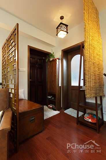 设计师点评:用樟木箱作为换鞋凳,既可以作为收纳箱,又可以充当换鞋凳。栅格的中式屏风作为隔断,竹帘起到遮挡作用,保护了私密性。